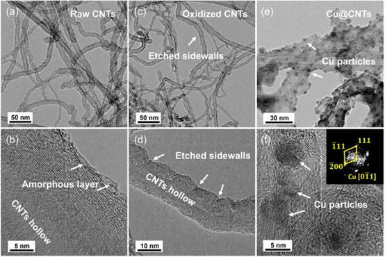 图2. 显微镜亮场(BF)TEM图像,显示(a)~(b)原始CNTs粉末,(c)~(d)酸化后的CNTs粉末和(e)~(f)合成后的Cu@CNTs粉末。