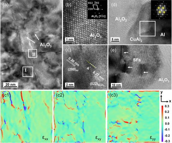 图7. Cu2O@CNTs/Al复合材料中典型的原位Al2O3微结构。(a) 晶内Al2O3晶须。(b)和(c) 在(a)中记录的选择区域I的HRTEM图像,分别显示Al2O3和Al2O3-Al界面。(c1)~(c3) 对应于(c)的应变场。(d) 在(a)中记录的选择区域II的放大图像,显示形成的CuAl2。(e) Al2O3周围形成的SFs。