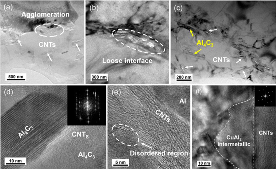 图5. Cu@CNTs/Al复合材料的典型TEM图像。(a) CNTs的分散状态。(b) 宽松的CNTs-Al界面。(c)和(d)不同放大倍数下形成的Al4C3。(e) Al-CNTs界面显示的无序区域。(f) CNTs-Al界面形成的CuAl2。