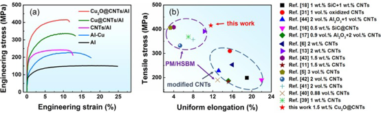 图8. (a) Al、Al-Cu、CNTs/Al、Cu@CNTs/Al和Cu2O@CNTs/Al样品的工程应力-应变曲线。(b) Cu2O@CNTs/Al复合材料与其他报道的CNTs/Al复合材料的力学性能比较。