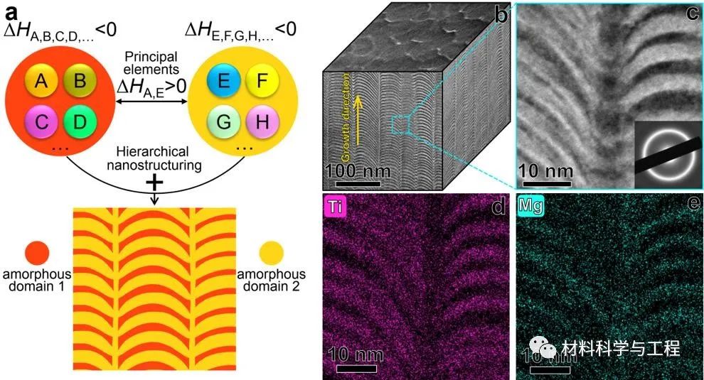 图1 混合焓指导合金设计。a 合金设计策略的示意图。 b 典型的平视和侧视明场TEM 图。 c 放大的 HAADF-STEM 图。 d-e EDS mapping图(这里只显示Ti与Mg)。