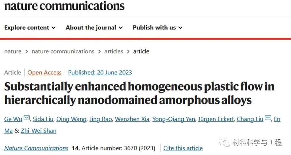 此工作以“Substantially enhanced homogeneous plastic flow in hierarchically nanodomained amorphous alloys”为题发表在Nature Communications。西安交通大学金属材料强度国家重点实验室为论文第一作者单位和第一通讯单位。吴戈教授(西安交大)为论文第一作者兼通讯作者,刘畅教授(西安交大)为论文共同通讯作者。作者包括:刘思达教授(山东大学,现已入职西安交大)、王庆教授(上海大学)、饶婧博士(德国马普所)、夏文真教授(安徽工业大学)、闫永强博士生(西安交大)、Jürgen Eckert教授(奥地利科学院)、马恩教授(西安交大)、单智伟教授(西安交大)。该研究得到了国家自然科学基金委及国家青年人才计划的支持。