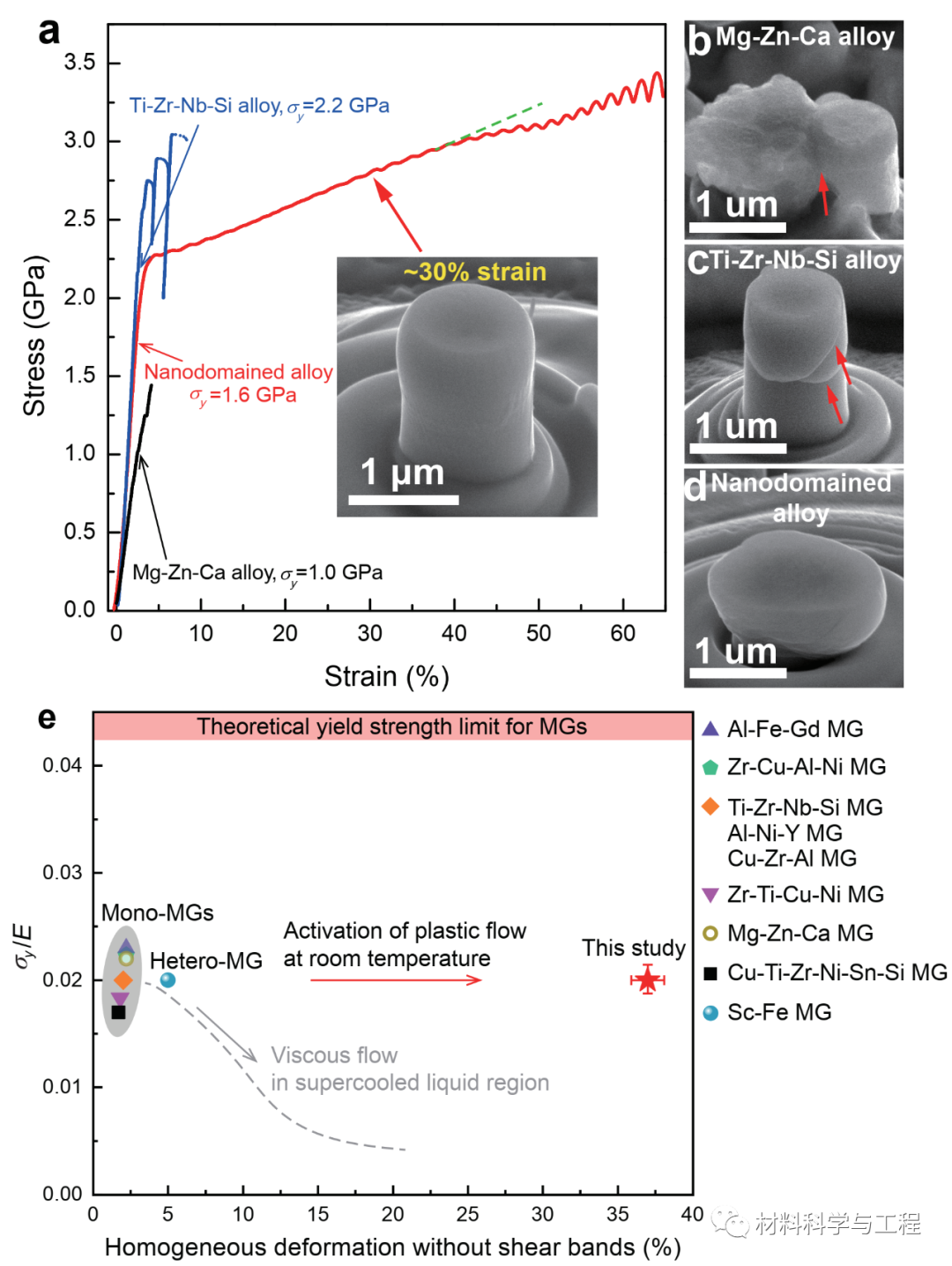 图 2 多级纳米化学异质非晶合金的力学性能。a 室温下相同测试条件下微柱样品的压缩工程应力-应变曲线。b-d 压缩后相应的Mg-Zn-Ca非晶合金、Ti-Zr-Nb-Si非晶合金和多级纳米化学异质非晶合金的SEM图。e 非晶合金归一化屈服强度(σy/E)与均匀形变(不产生剪切带)性能比较图。