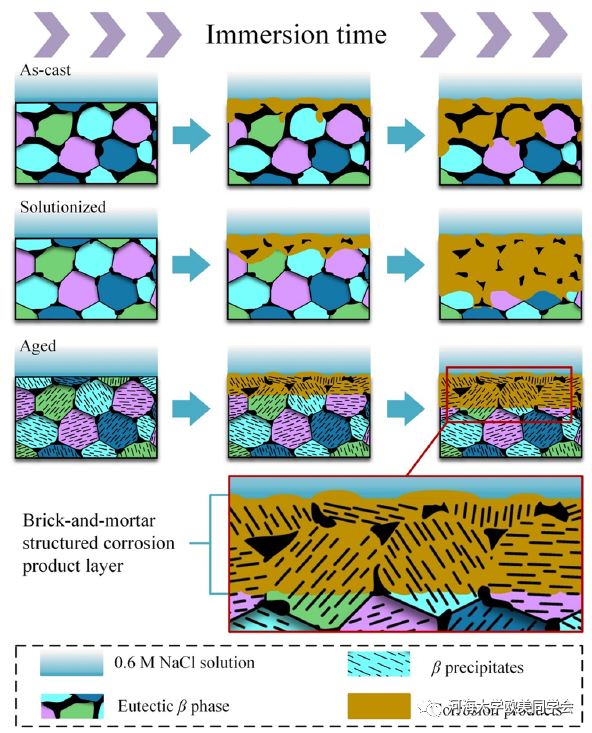 腐蚀测试显示,时效态镁合金初期的耐蚀能力由于较强的微电偶腐蚀效应存在而弱于铸态和固溶态,但随着腐蚀的进行,β相的屏障效应凸显,使得耐蚀能力优于其它两种状态的合金。通过有限元模拟和微观形态观察,推测腐蚀产物膜和分级结构β相构成了类“砖-浆”结构,其“膜-相”协同调控是镁合金耐蚀性较大幅度改善的主因(图2)。