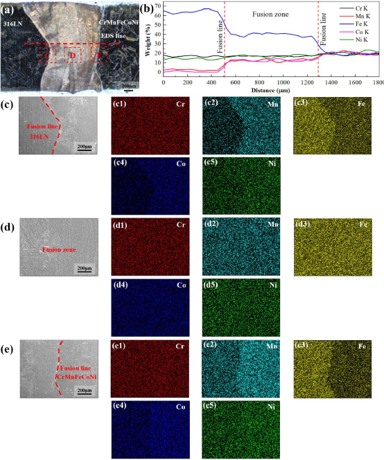 图 1 焊接接头的SEM/EDS线和图图像:(a)宏观形貌,(b)线图像的元素分布,(c)316LN侧熔合线附近的图图像,(d)CrMnFeCoNi侧熔合线附近的图图像和(e)熔合区中心的图图像。