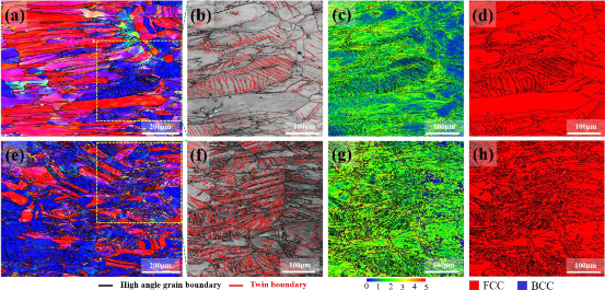 图 7 断裂表面附近焊接接头的EBSD图像:(a)室温时的IPF图,(b)室温下的放大BC图像,(c)室温下的KAM图像,(d)室温时的相位图,(e)77 K时的IPF图,(f)77 K处的放大BC图像,(g)77 K处的KAM图像,(h)77 K处的相位图。