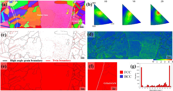 图 2 焊接接头的EBSD图:(a)和(b)反极图(IPF)图,(c)晶界,(d)KAM图,(e)和(f)相图,(g)晶粒取向误差角。