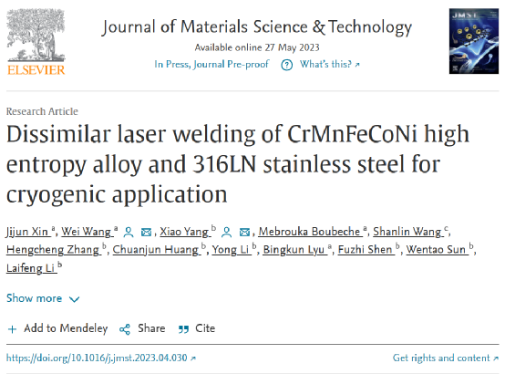 在聚变磁体结构的运行过程中,低温下接头的力学性能起着至关重要的作用,使其能够承受严苛的运行要求,否则将暴露焊接接头在极低温度下的不充分断裂行为。松山湖材料实验室王伟、中国科学院理化技术研究所低温重点实验室肖扬等研究团队对母材及其焊接件的力学性能进行了研究。尽管对母材及其焊接件的力学特性已有研究,但对高熵合金异种焊接接头的微观组织演变及低温力学性能的研究仍较为缺乏。本文研究了CrMnFeCoNi合金与316LN低温异种激光焊接接头的微观组织和力学性能。两种材料的有效焊接将提高高熵合金作为聚变反应堆、氢能等应用的结构材料的潜力。相关研究成果以“Dissimilar laser welding of CrMnFeCoNi high entropy alloy and 316LN stainless steel for cryogenic application”为题,发表在《Journal of Materials Science & Technology》上。