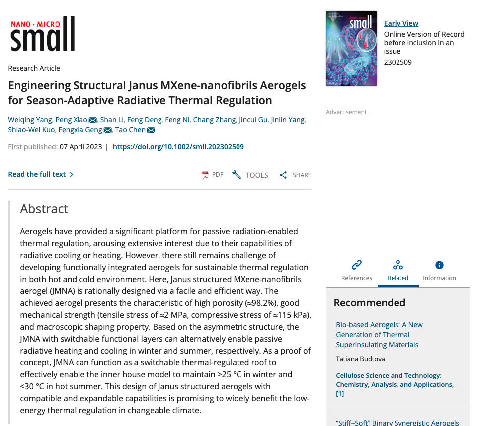 之前的工作中,已经通过反向聚合在织物表面设计了由聚吡咯和全氟十二烷基三乙氧基硅烷组成的超疏水仿生类黑素体分级纳米球织物,实现了人体热管理温度调节和光热蒸发应用(Nano Lett. 2022, 22, 9343-9350)。但是在材料稳定性和季节适应性温度调节方面仍有不足。基于此,中国科学院宁波材料技术与工程研究所智能高分子材料团队陈涛研究员、肖鹏副研究员通过免冻干的方法,设计了由光热MXene-CNF层和CNF层组成的Janus结构气凝胶(JMNA),该气凝胶能够实现可切换的热调节,将被动辐射冷却和加热集成到一个材料系统中,以适应多变的环境。