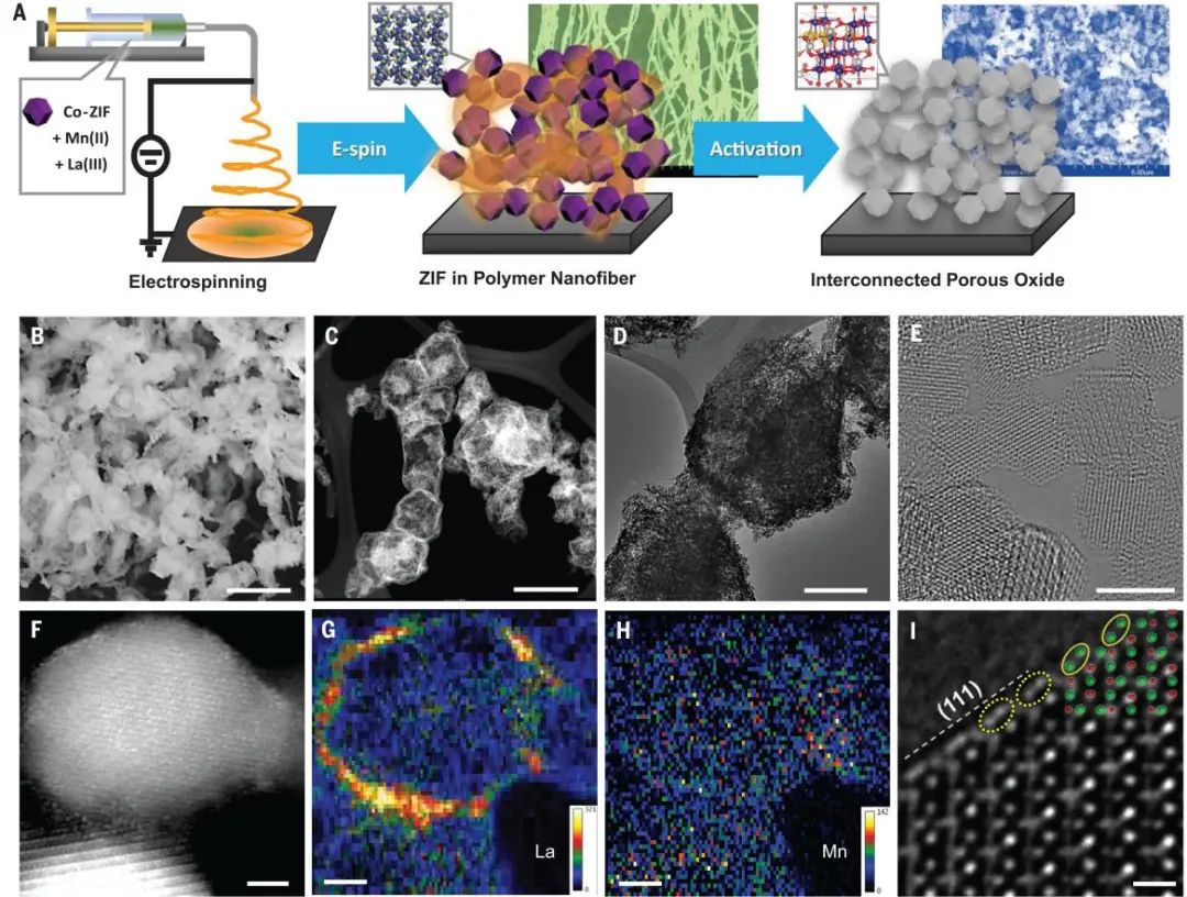 基于此,本工作首先合成出La和Mn共掺杂的Co-ZIF,随后悬浮分散在聚丙烯腈浆料中通过静电纺丝成纤维,并在360℃流动空气中活化得到最终的催化剂(LMCF)(图1A)。形貌表征揭示了LMCF呈现出相互连接的纳米纤维网络形貌,而在相互缠绕的纳米纤维之间则具有丰富的大孔;另外,单个LMCF颗粒保留了Co-ZIF的原始菱形十二面体形状,并呈串状排列融合,每个颗粒由Co3O4纳米晶粒聚集而成,平均尺寸约为3.5 nm(图1B到图1E)。进一步,元素面扫描显示La主要在表面呈局域分布,而Mn主要分布在块体中(图1F到图1I)。