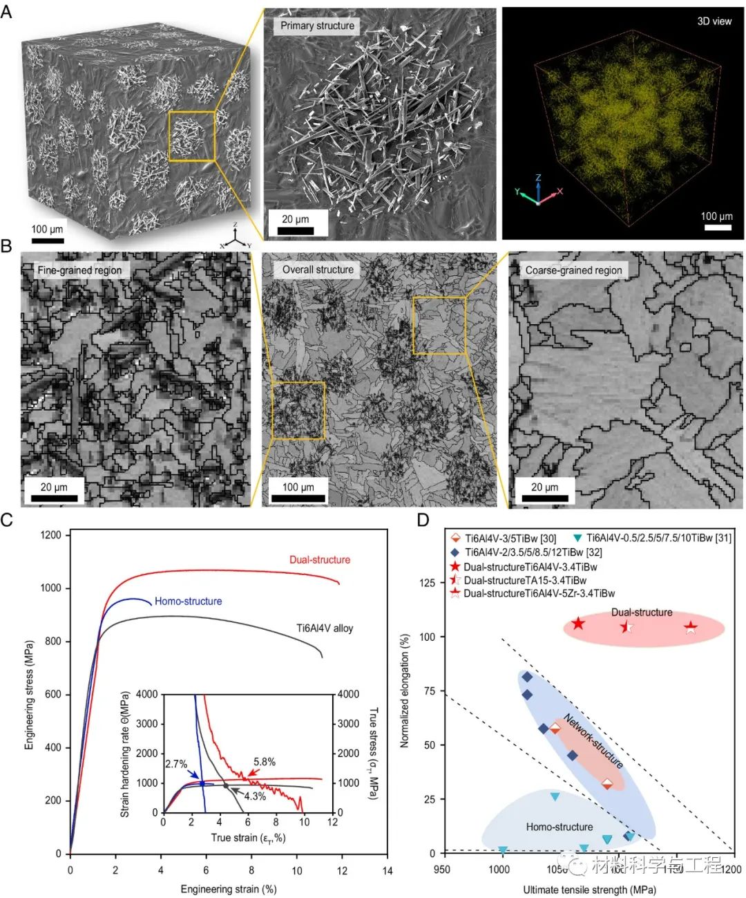 图1. 双结构TC4-TiBw复合材料的典型组织和力学性能