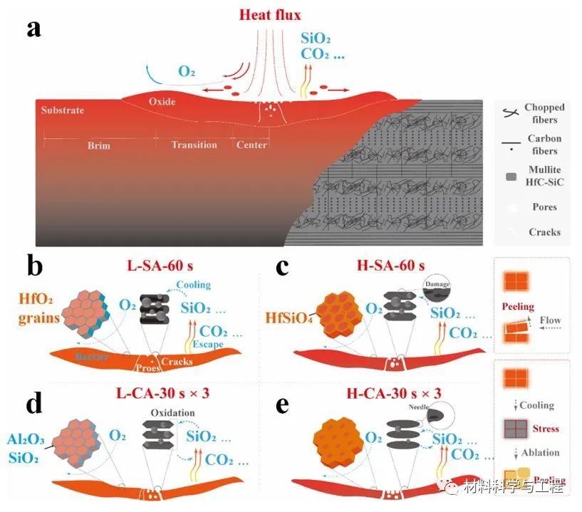 结果表明,烧蚀温度在烧蚀过程中起着至关重要的作用。在较低的热通量条件下,单次烧蚀行为主要受气态氧化产物逸出和轻微气流侵蚀的影响,而循环烧蚀主要受加热-冷却过程中结晶转化引起的应力影响。在较高的热通量条件下,HfO2和SiO2之间的界面逐渐生成HfSiO4,从而稳定了HfO2的结晶。较高热通量下的烧蚀行为主要受到热应力和高速气流机械力的影响。