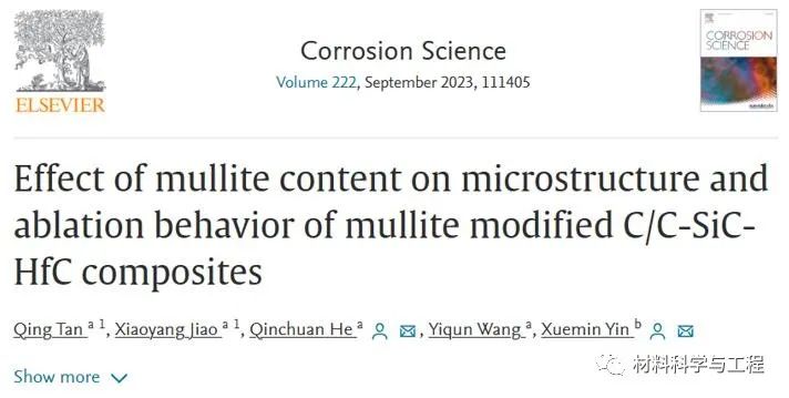 在发表于Corrosion Science题为“Effect of mullite content on microstructure and ablation behavior of mullite modified C/C-SiC-HfC composites“的相关论文中,通过前驱体浸渍裂解法(PIP)制备了不同莫来石含量改性的C/C-SiC-HfC复合材料,并在4.18MW/m2热通量的氧乙炔火焰条件下烧蚀60 s,研究了不同含量的莫来石改性对复合材料的成分、微观结构和烧蚀行为的影响。