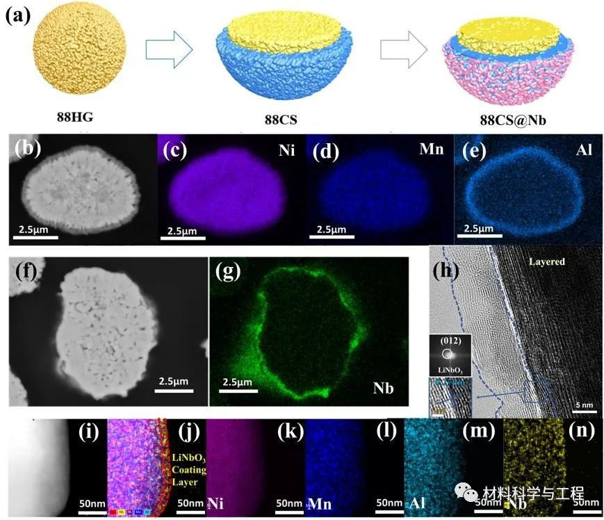 1. 提出了具有低镍含量外壳的核壳结构NCMA以及进一步包覆LiNbO3的双改性正极材料