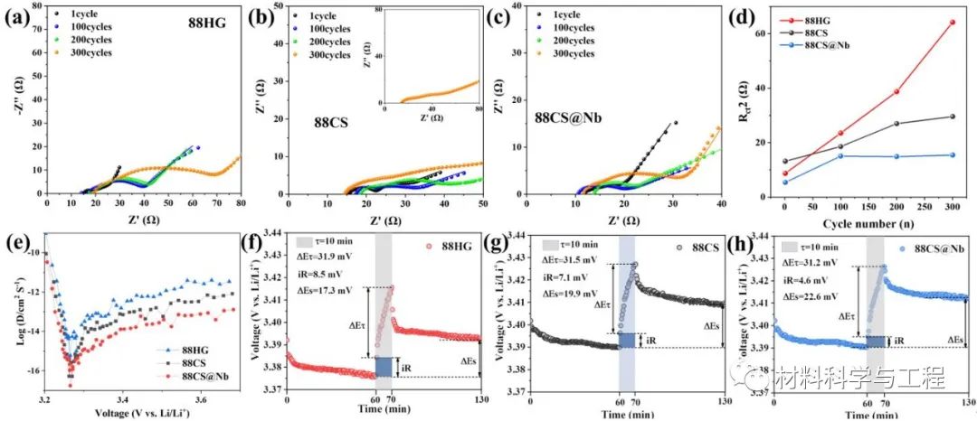 为了进一步评估改性材料的离子传输动力学,我们采用了GITT技术来评估离子传输速率。计算得出88HG、88CS和88CS@Nb阴极的平均DLi+值分别为1.75×10-14、4.66×10-14和1.28×10-13 cm2 s-1。这表明LiNbO3包覆层有效提升了界面的离子传输。此外,还选择了充电过程中约3.4V的H1-M相变平台作为特征点,以进一步考察材料的Li+扩散能力和极化情况。可以得出由于与界面的副反应显著减少,表面改性材料的iR、Et和Es明显降低,这意味着离子传输速率更佳,极化程度更低。