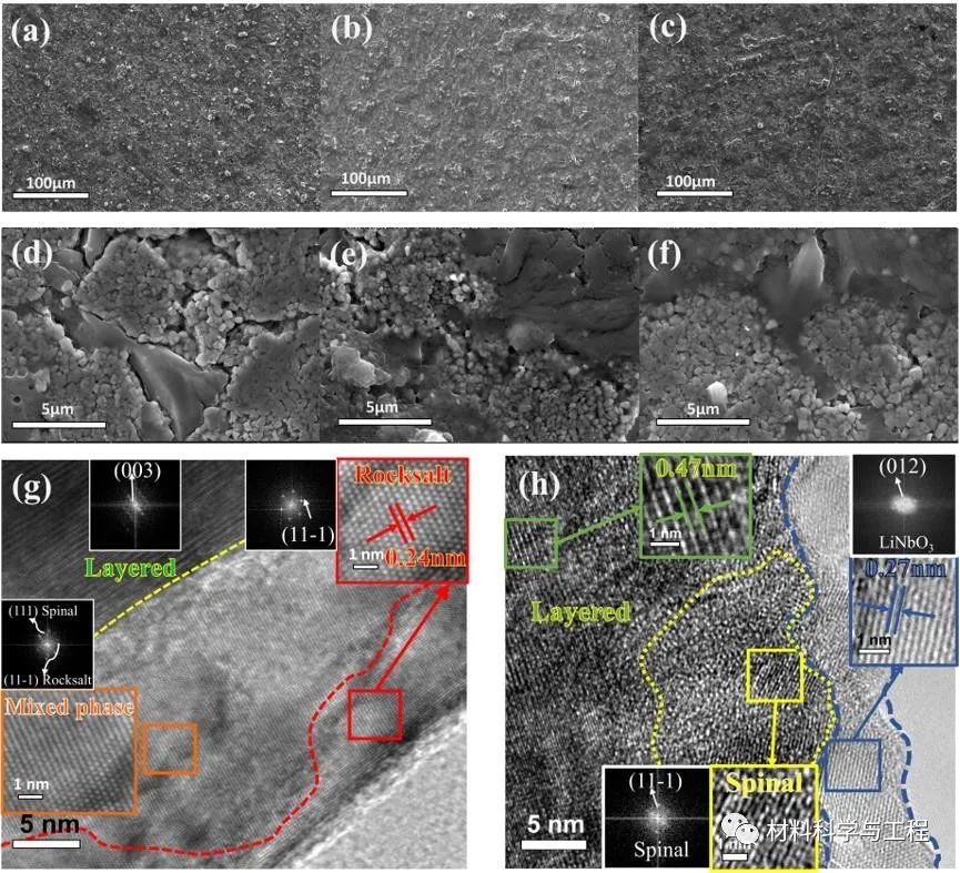 使用HRTEM分析了循环后88HG和88CS@Nb的阴极颗粒。循环后的88HG材料在原始层状相的表面生成尖晶石相和岩盐相的混合结构,甚至在材料的最外层表面形成了纯岩盐相。循环后形成的相变层厚度约为20nm,这意味着阴极材料受到了严重破坏,表面的惰性相进一步阻碍了锂离子的扩散,导致材料的电化学性能恶化。而88CS@Nb阴极的尖晶石相仅在循环后靠近表面的局部区域形成,这表明表面改性材料大大缓解了界面副反应。