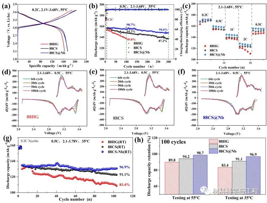 循环充放电试验旨在研究88HG、88CS和88CS@Nb阴极材料的循环性能。88HG、88CS和88CS@Nb阴极的首圈库仑效率分别为85.8%、84.8%和86.6%,较高的库仑效率反映了锂离子在阴极和固态电池之间的传输阻碍较小,在第一次充放电过程中发生的极化反应较少,这表明核壳结构的构建并不影响库仑效率,而LiNbO3的包覆导致界面上锂离子的传输增强,从而提高了88CS@Nb阴极的库仑效率。固态电池活化后在0.5C下经过100次循环后,88HG、88CS和88CS@Nb阴极的容量保持率分别为89.8%、94.2%和98.7%。在长循环测试中,88CS和88CS@Nb阴极在300次循环后的容量保持率分别为87.3%和94.6%。这种阶跃式差距反映了具有低镍含量外壳的核壳结构阴极材料能有效减弱循环过程中界面反应引起的容量衰减,而LiNbO3包覆层则起到了促进Li离子传输和降低界面副反应强度的作用,进一步使界面稳定性得到显著提高。倍率性能方面,88CS@Nb阴极材料在2C时保持了128.8 mAh g-1的高放电容量,而88HG和88CS阴极在2C时的放电容量分别为121.2mAh g-1和124 mAh g-1,这表明核壳结构和LiNbO3涂层层协同促进了锂离子通过界面的快速传输。dq/dv曲线显示出,88CS@Nb阴极的峰值移动和衰减最轻,曲线几乎完全重合。这表明88CS@Nb具有良好的循环可逆性,88CS@Nb与SSE之间的界面反应强度较低。对三种阴极材料在室温(35℃)下的性能进行了测试,88CS@Nb阴极在室温下仍然表现出优异的性能,在0.5C时的初始放电容量为134.8 mAh g-1,优于88CS(134.6 mAh g-1)和88HG(130.1 mAh g-1)阴极材料。此外,在100次循环后,它仍然表现出优异的容量保持率(96.9%),与88CS(91.1%)和88HG(83.4%)相比具有明显优势。