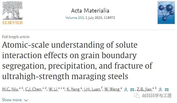 相关研究结果以“Atomic-scale understanding of solute interaction effects on grain boundary segregation, precipitation, and fracture of ultrahigh-strength maraging steels”发表于Acta Materialia, 2023, 253: 118972。