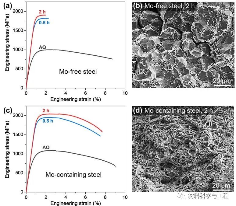 图1.无Mo钢和含Mo钢在不同时效状态下的拉伸曲线和时效2 h拉伸后的断口形貌