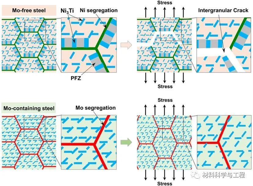 近期,中国科学院金属研究所特种合金研究部先进特殊钢团队牛梦超博士、王威研究员、杨柯研究员联合香港理工大学焦增宝教授,针对Fe-Ni-Ti基马氏体时效钢时效后出现的晶间脆性问题,通过研究溶质原子相互作用对晶界偏析、析出和断裂的影响,发现高强度马氏体时效钢晶界处形成粗大的Ni3Ti析出相和相应的无析出区(PFZs)是造成晶间脆化的主要原因,这些区域有利于裂纹在晶界处形核和扩展,同时研究发现,通过合理的Mo合金化,能够有效抑制晶间脆化,从而大大提高钢材的韧性。从原子尺度分析显示,Mo可以减少Ni和Ti在晶界的偏析,有效地抑制粗大的Ni3Ti析出物和PFZs在晶界处的形成,同时,Mo偏析增强了晶界的凝聚力,这也可能在抑制沿晶断裂方面起到了次要作用。