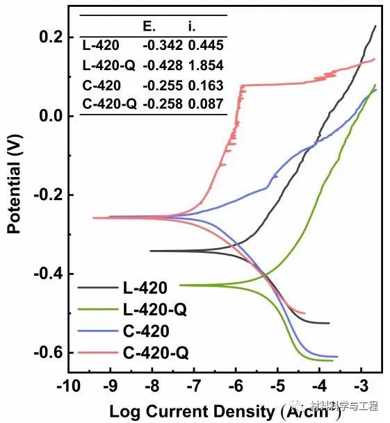 图 2. L-420、L-420-Q、C-420 和 C-420-Q 样品的动电位极化曲线、腐蚀电位 (E.) 和腐蚀电流密度 (i.) 列于表中。