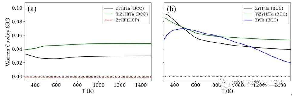 图5 Warren-Cowley短程有序参数随温度的变化情况:(a)Zr-Hf原子对,(b)Zr-Ta原子对。这里对比了ZrHf(hcp)、ZrTa(bcc)、ZrHfTa(bcc)和TiZrHfTa(bcc)合金短程有序化的差异性。
