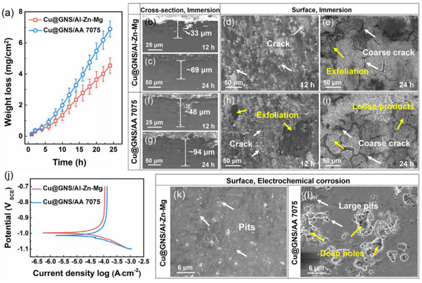 (3)晶内Cu@GNS增强相通过抑制晶界原电池网络的形成提升了复合材料的腐蚀抗力。