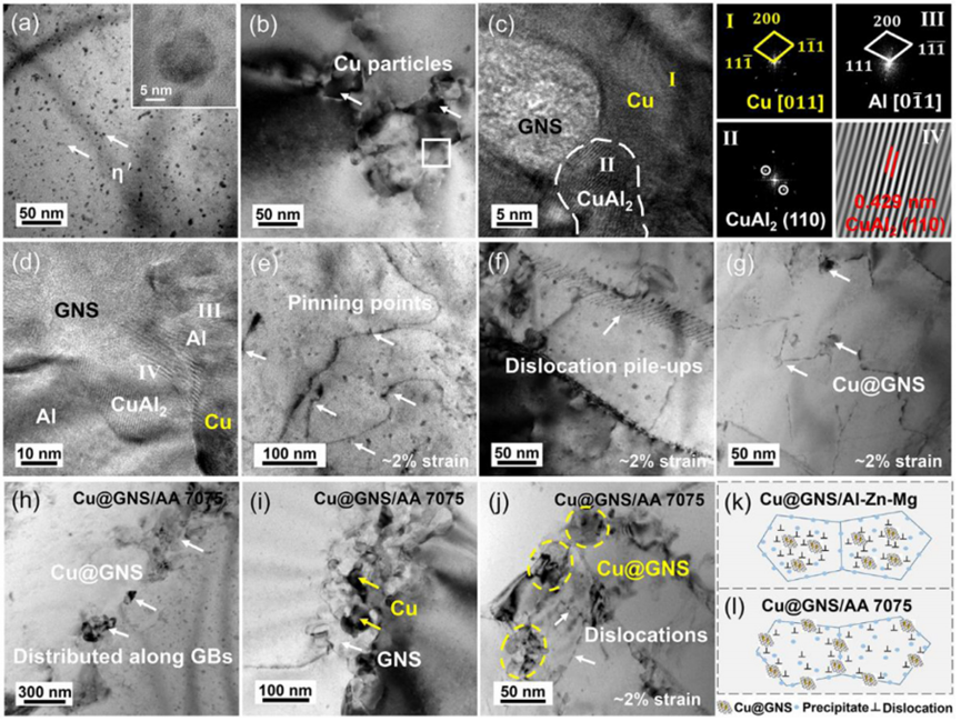 图2 Cu@GNS/Al-Zn-Mg复合材料中(a)沉淀相和(b)~(d)界面结构;(e)~(g)Cu@GNS/Al-Zn-Mg复合材料在2%应变量下的变形亚结构;(h)~(j)Cu@GNS/AA 7075复合材料初始态和2%变形量下的微观组织;(k)Cu@GNS/Al-Zn-Mg复合材料和(l)Cu@GNS/Al-Zn-Mg复合材料中第二相-位错交互作用示意图。