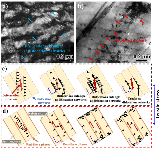 该研究还通过热力学计算和显微组织观察,揭示了σ相的形成机制和以及变形过程中的位错疏导机制。研究发现,σ相可以分为两种,富Cr的σA相主要在最终凝固过程中析出,而富Mo的σB相在凝固初期析出,这导致了σB相在凝固过程中不断阻碍亚晶长大,并且伴随基体同步生长,促进了σ相框架的形成。σ相框架的引入提高了变形过程中位错滑移的阻力,同时框架对基体的固定作用显著诱导了位错沿平行于析出相方向进行滑移,避免了亚结构边界的位错塞积而引起的局部应力集中,进一步提高了高熵合金抵抗不均匀塑性变形的能力。该设计理念将为同时提高激光增材制造高熵合金的强塑性提供新思路,为金属材料力学性能强化机制的进一步完善添砖加瓦。