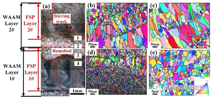 此外,还可以采用梯度微观结构设计,实现强度和延性的同步提高。通过制备从超细晶粒到常规晶粒的连续梯度过渡微观结构,该材料具有更好的强塑性匹配、抗裂性和疲劳性能。因此,本文提出了将WAAM和FSP相结合的新型复合增材制造方法来制造梯度微观结构2319合金,探讨了层间FSP处理在形成特征微观结构中的作用。