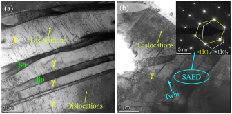 图9。对经历不同真应变的PM进行TEM检测。( a ) 4 %;( b ) 10 %。( b )中插入的SEAD验证了成对出现的孪生衍射斑点。