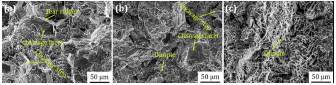 图10 . LM、T - T1和T - B结构在750℃拉伸后的断口形貌;( b ) T - T1结构;( c ) T - B结构。