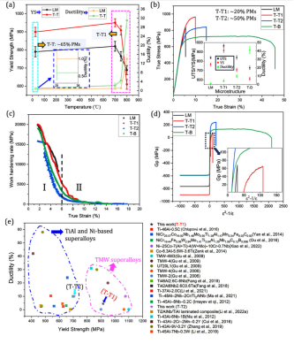 图4 .各种微观组织的拉伸力学性能。( a )在800°C ( 25°C ,如蓝色箭头所示)以下,T - T1比LM具有更好的强度和塑性。( b ) LM、T - T1、T - T2和T - B组织的750°C真拉应力-真应变曲线,其中内含物直接说明了强度-塑性的折衷。( c )真实应变-加工硬化率曲线。( d )四种组织的应变硬化模量-应变曲线表明,T - T2组织具有最佳的强度-延展性,即矩形区域的扩大。( e )比较了具有T - T1和T - T2结构的TNM合金(本工作)和其他在750°C使用的合金,包括TiAl合金,Ni基和Co基高温合金之间的屈服强度和延展性。注意到图4 ( a )中PM ( 65 % )在25°C和高温( 20 % )下的最佳比例不同。误差棒表示均值的标准差。
