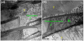图8 . ( a ) BF - TEM照片显示在α2 /γ或βo /γ界面处有高密度的位错和位错塞积。( b ) TEM BF像显示了βo相中的位错滑移和位错网络。