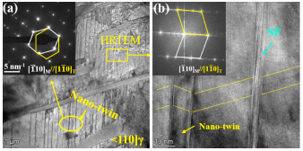 图7 . 750°C下粉末冶金的变形机制。( a ) BF - TEM照片显示了高密度纳米孪晶的发展;插入的SEAD花样为孪晶衍射花样。( b ) ( a )中黄色盒子的HRTEM和FFT花样进一步证明了纳米孪晶的形成。在相邻的孪晶之间观察到SFs。