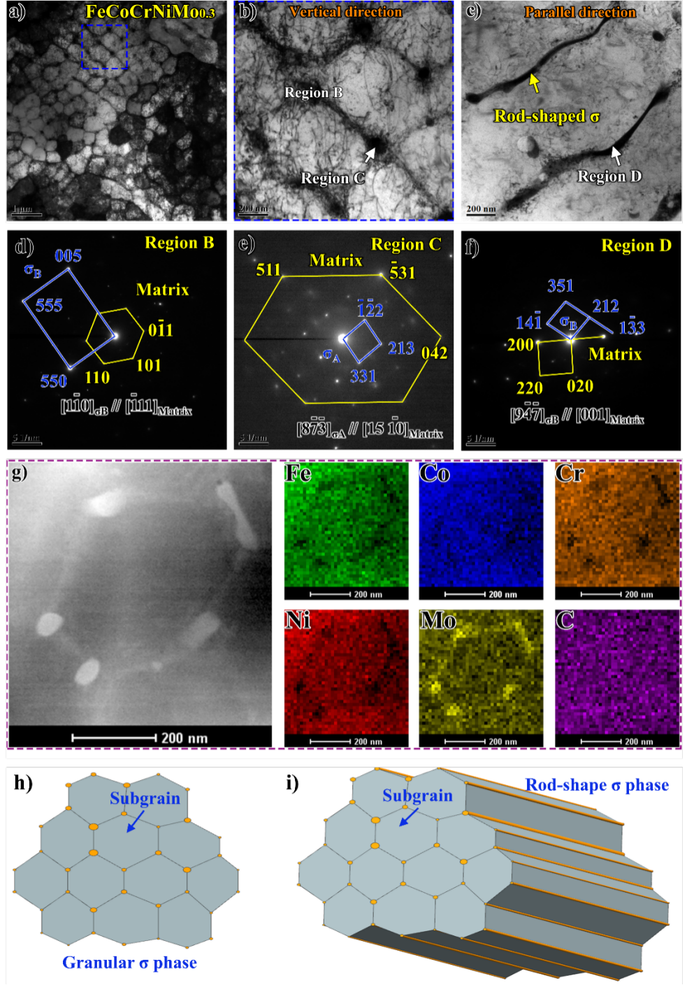 该研究还通过热力学计算和显微组织观察,揭示了σ相的形成机制和以及变形过程中的位错疏导机制。研究发现,σ相可以分为两种,富Cr的σA相主要在最终凝固过程中析出,而富Mo的σB相在凝固初期析出,这导致了σB相在凝固过程中不断阻碍亚晶长大,并且伴随基体同步生长,促进了σ相框架的形成。σ相框架的引入提高了变形过程中位错滑移的阻力,同时框架对基体的固定作用显著诱导了位错沿平行于析出相方向进行滑移,避免了亚结构边界的位错塞积而引起的局部应力集中,进一步提高了高熵合金抵抗不均匀塑性变形的能力。该设计理念将为同时提高激光增材制造高熵合金的强塑性提供新思路,为金属材料力学性能强化机制的进一步完善添砖加瓦。