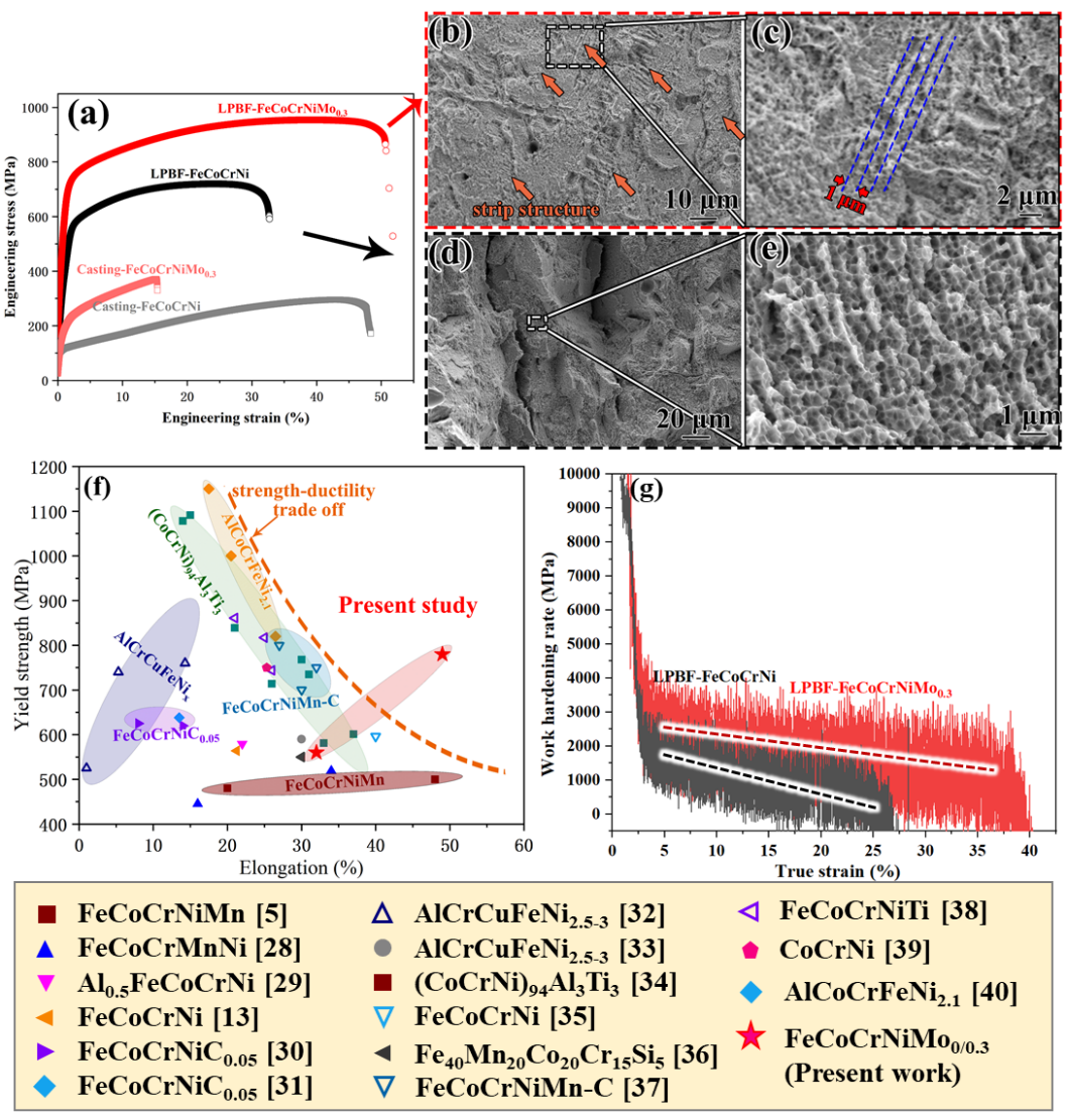 近日,由哈尔滨工业大学威海校区材料科学与工程学院宋晓国教授领导的研究团队联合北京动力机械研究所以及南京理工大学,利用激光增材制造技术实现了高强塑性高熵合金制备,研究成果以“Fabrication of a strong and ductile FeCoCrNiMo0.3 high-entropy alloy with a micro-nano precipitate framework via laser powder bed fusion”为题,发表在复合材料顶刊《Composites Part B: Engineering》(中科院一区TOP期刊,IF:13.1)上(原文链接为https://www.sciencedirect.com/science/article/pii/S1359836823005097)。林丹阳副研究员为该论文的第一作者,宋晓国教授为该论文的通讯作者。