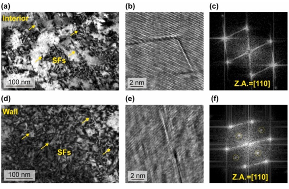 图8 . HT - HEA试样的显微组织均变形至 28 %塑性应变。( a ) TEM图像显示SFs在内部。( b ) HRTEM图像显示FCC基体被SFs剪切。( c )显示了( b )的FFT衍射图样,表明SFs的存在。( d ) BF - TEM照片显示高密度的SFs及其在管壁中的强相互作用。( e ) HRTEM成像给出了SFs剪切L12析出相的典型例子。( f )显示了( e )的FFT衍射,超晶格斑点被黄色圆突出。
