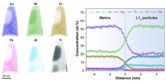 图5 . APT针的三维重构显示了Co、Ni、Cr、Fe、Al和Ti原子的分布。L12 / FCC界面的典型化学轮廓显示了元素在HT - HEA壁中的分配行为。