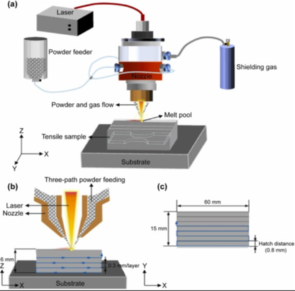 图2 . ( a ) DED过程示意图。( b )和( c )显示了XOZ和XOY平面上的扫描路径。