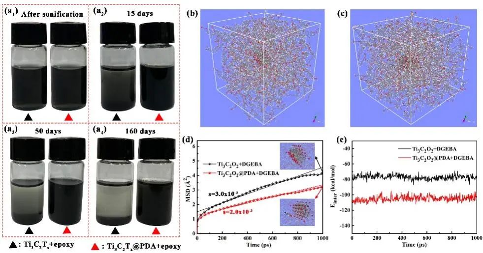图2. Ti3C2Tx@PDA在环氧树脂中分散性及分子动力学验证。