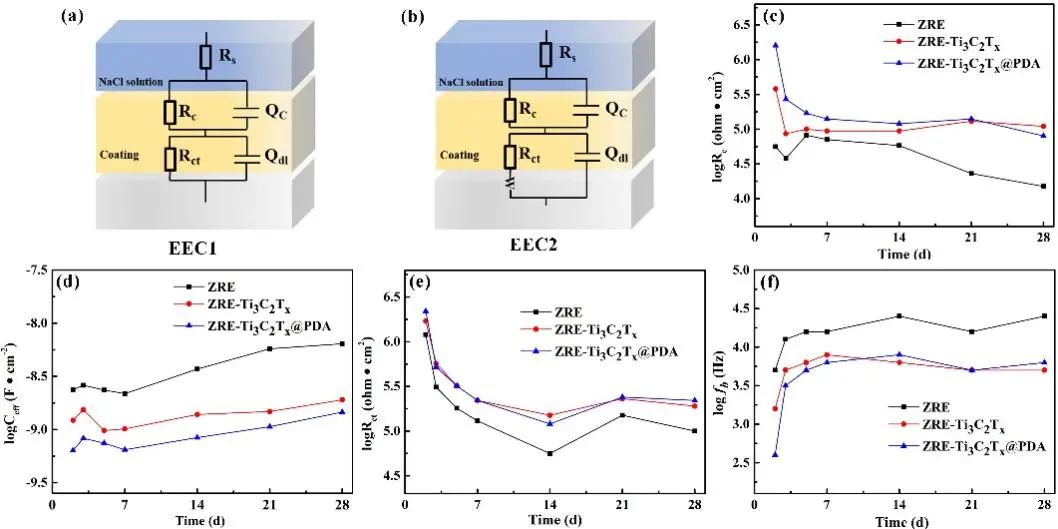 图3. (a1-a3)ZRE、(b1-b3)ZRE-Ti3C2Tx、(c1-c3)ZRE-Ti3C2Tx@PDA复合涂层EIS。