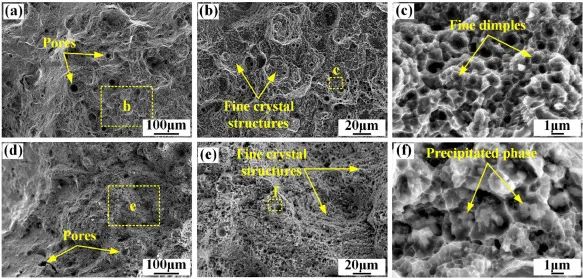 图9.AlNi6TiZr合金的断口形貌为(a-c) AB状态和(d-f) at – 12小时状态。