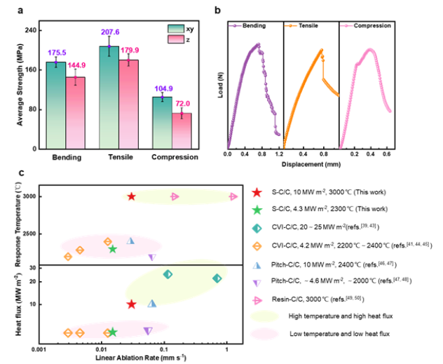S-C/C 的机械性能为弯曲强度高达 187.24 兆帕,拉伸强度高达 231.16 兆帕,压缩强度高达 113.65 兆帕(图 5a),与文献中报道的同类材料相当。在热物理性质方面,本研究制备的 S-C/C 在室温下 xy 方向的热导率高达 117.6 W m-1 K-1,z 方向的热导率超过 60 W m-1 K-1。图 5C 比较了不同碳源制备的 C/C 复合材料的耐烧蚀性。在高温或高热通量条件下,碳氢化合物碳源制备的 C/C 复合材料的烧蚀速率大于 0.05 mm s-1,远高于 S-C/C 复合材料。上述结果清楚地表明,用糖类取代碳氢化合物不可再生碳源制备的碳/碳复合材料也具有优异的耐烧蚀性。