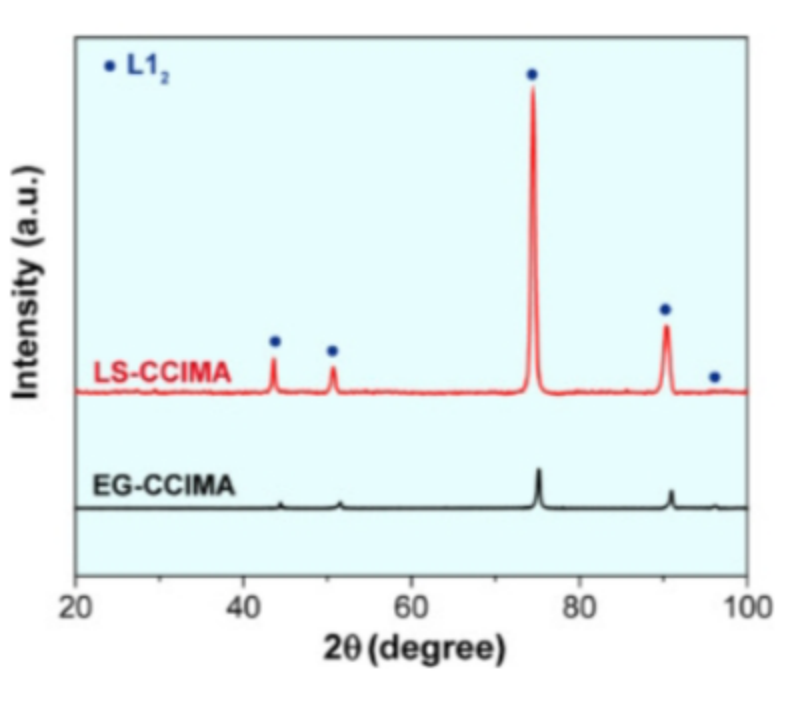 图3 EG和LS-CCIMA的XRD图谱显示了有序的L12型相。