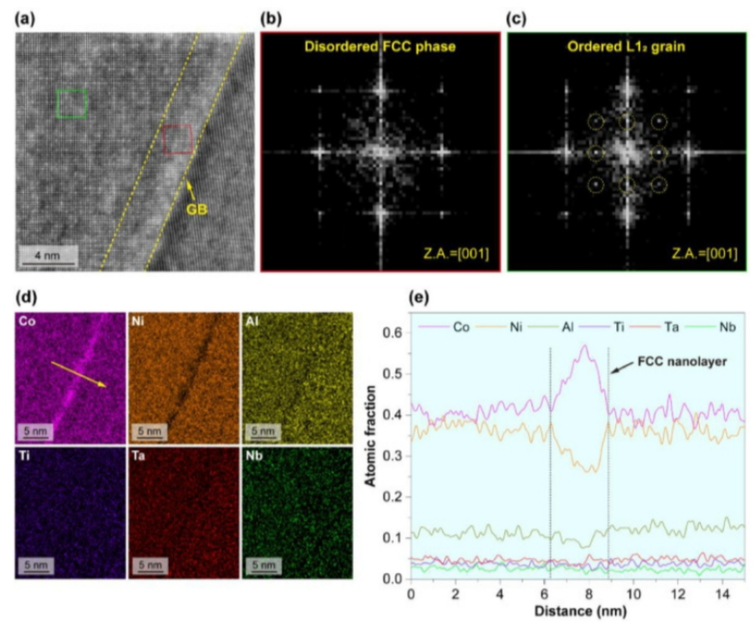 图5 (a)-(c)高分辨率TEM和FFT图像揭示了无序的FCC纳米层在GB附近形成。(d) STEM-EDS映射显示了GB的Co隔离。(e) 整个大不列颠的相应化学概况表明公司明显分离。。