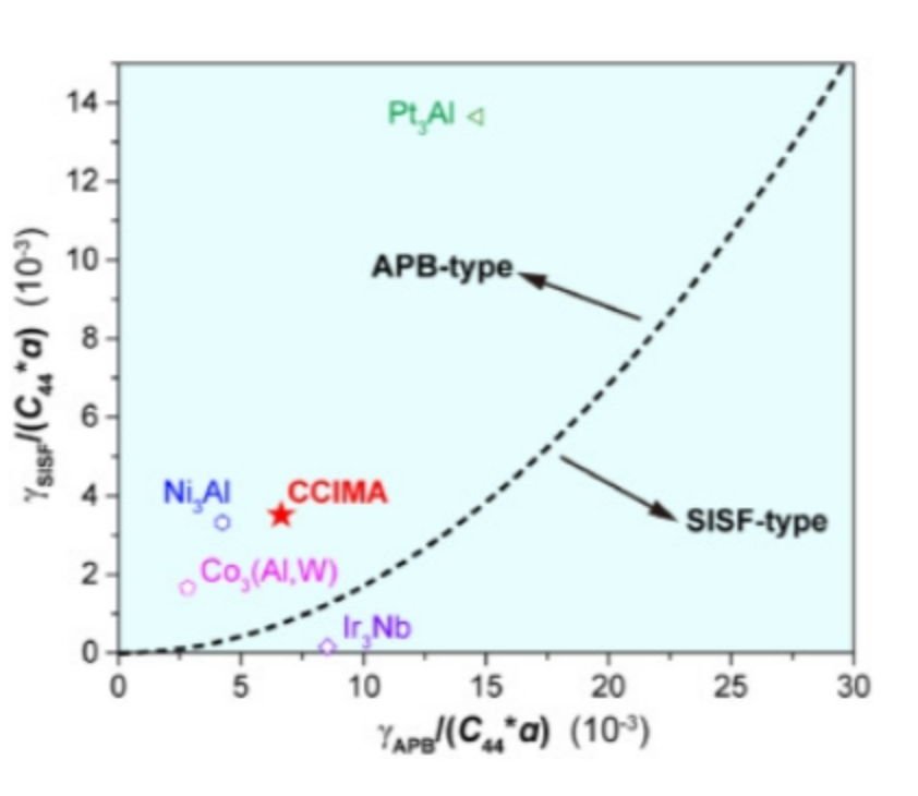 图11 预测 [`101] 我们开发的CCIMA中的超晶格位错。还包括其他一些化学简单的L12型金属间化合物,如Ni3Al,Ir3Nb,Co3(Al,W)和Pt3Al合金。