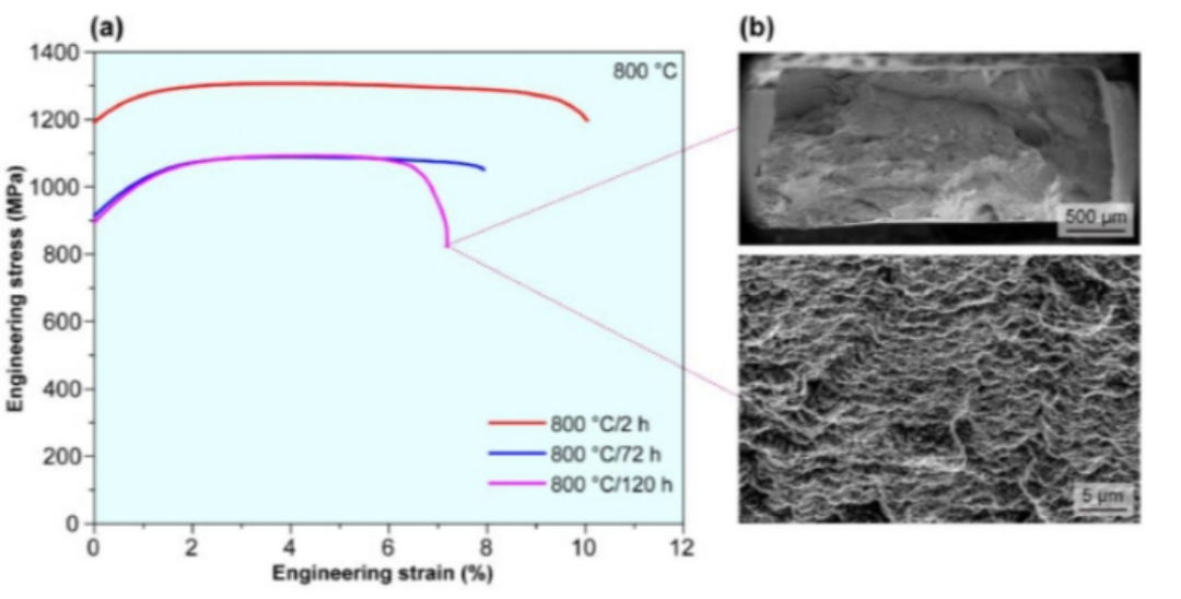 图7 LS-CCIMA在长期热暴露长达120小时后,在800 °C下具有优异的中间温度性能。(a)在800 °C下暴露120 h后,LS-CCIMA显示出 900 MPa的高YS,在800 °C时具有 8%的拉伸伸长率。(b)呈现典型的韧性断裂模式以及致密的凹坑。
