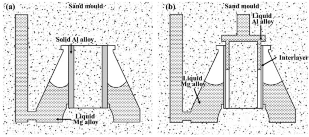 图1. 复合铸造的示意图:(a) 固-液复合;(b) 液-液复合。