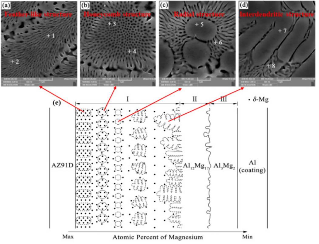 图7. SEM形貌与镁元素成分的关系:(a) 羽毛状结构;(b) 蜂窝状结构;(c) 辐射状结构;(d) 柱间结构;(e) 成分和形貌的示意图。